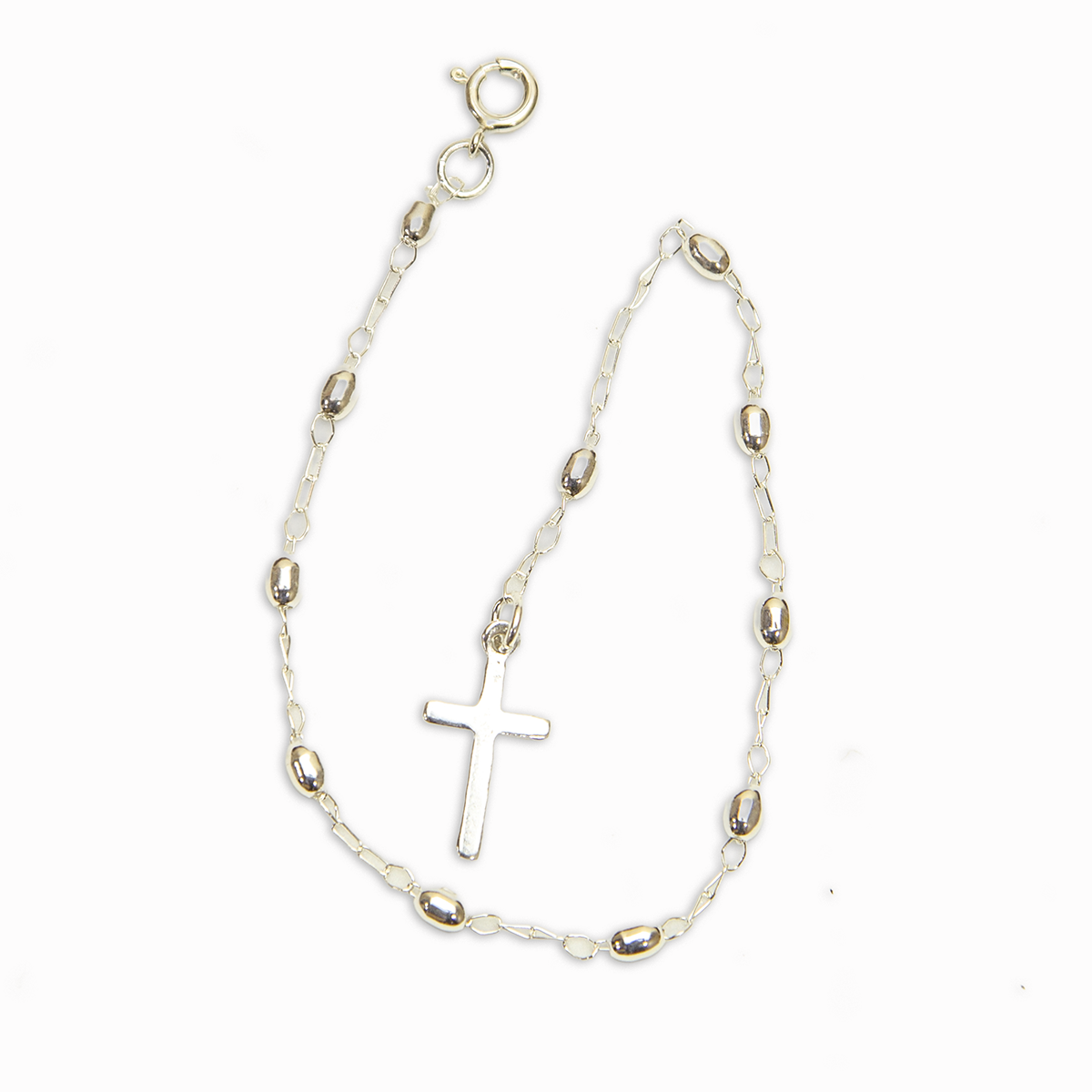 Elegante y devocional pulsera denario elaborada en plata, con cuentas en forma de grano de arroz y cruz sencilla en acabado brillante. Un accesorio delicado que une fe y estilo, ideal para llevar la oración en todo momento.