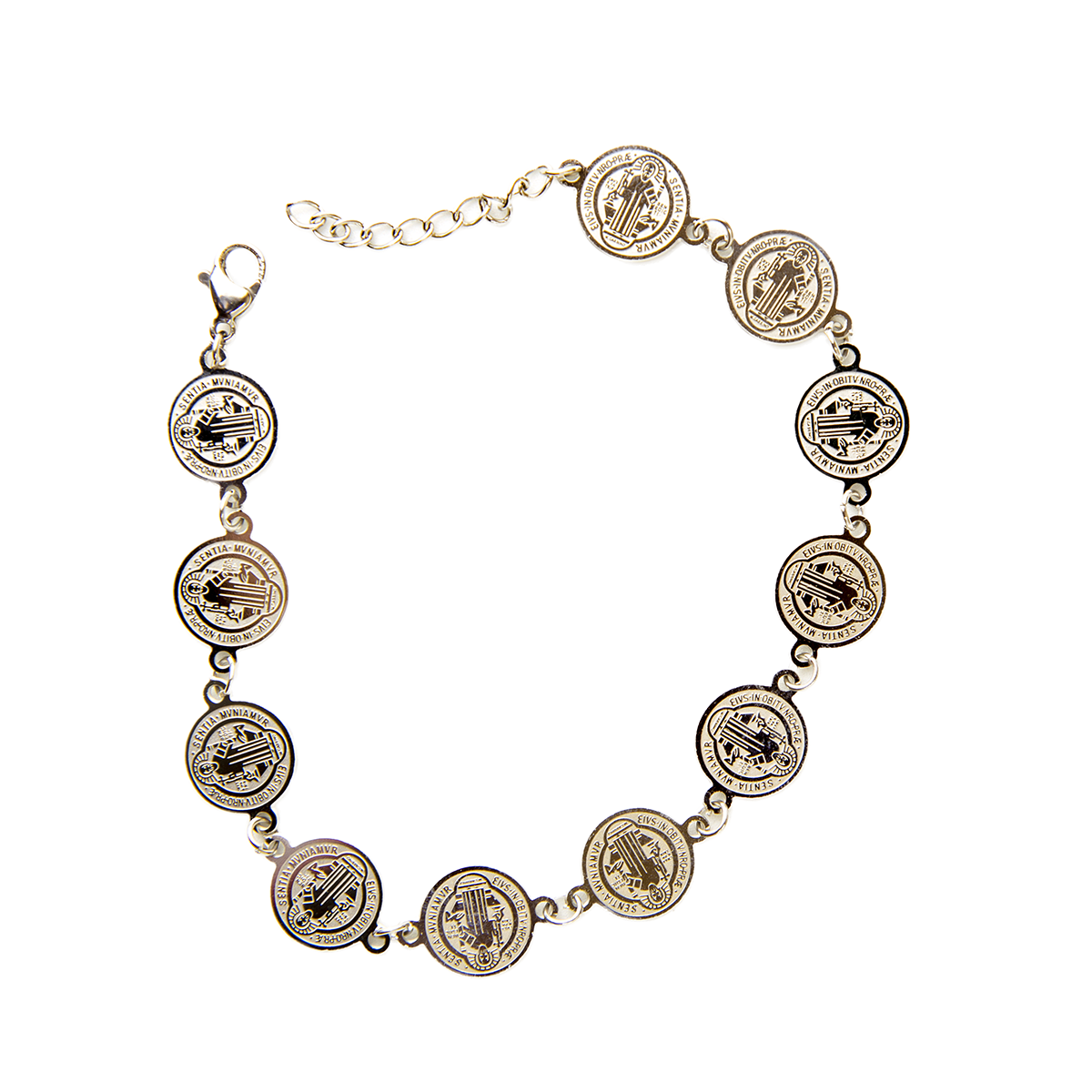 Una pulsera llena de significado espiritual, elaborada en acero resistente, adornada con múltiples medallas de San Benito, símbolo de fe y protección contra el mal. Su diseño elegante y sobrio la convierte en un accesorio ideal para portar diariamente.